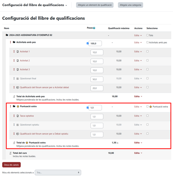 Captura de pantalla configuració llibre de qualificacions amb puntuació extra