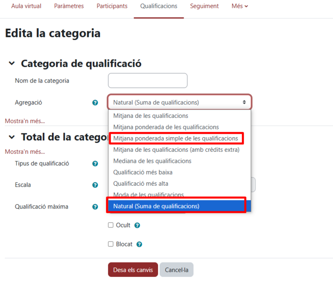Captura de pantalla que mostra la Edició de la categoria de qualificació